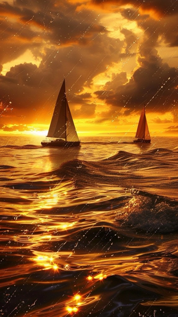 photorealistic sunset over calm ocean, two sailboats, rainy sky, golden light on wet water surface –v 6 –ar 16:9